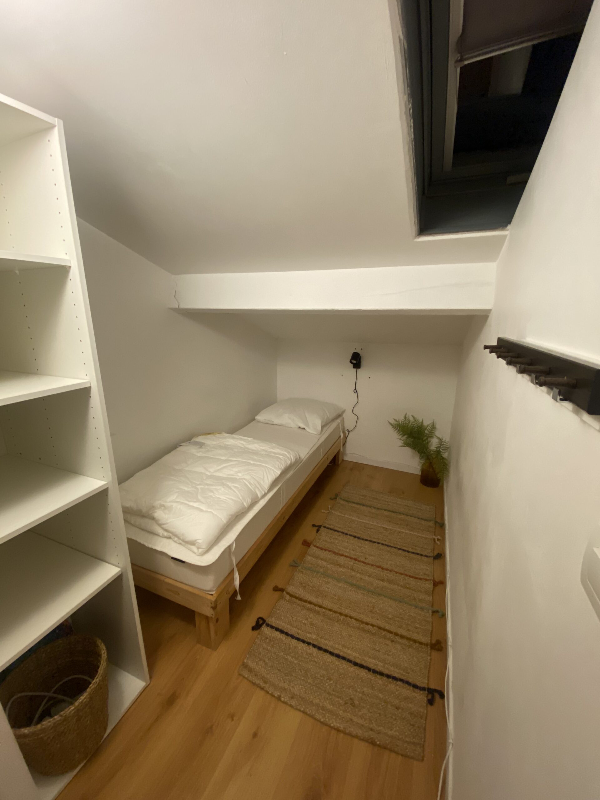 Bemærk, at lejligheden ikke er egnet for gangbesværede, da en smal og vinklet trappe forbinder de to etager.
