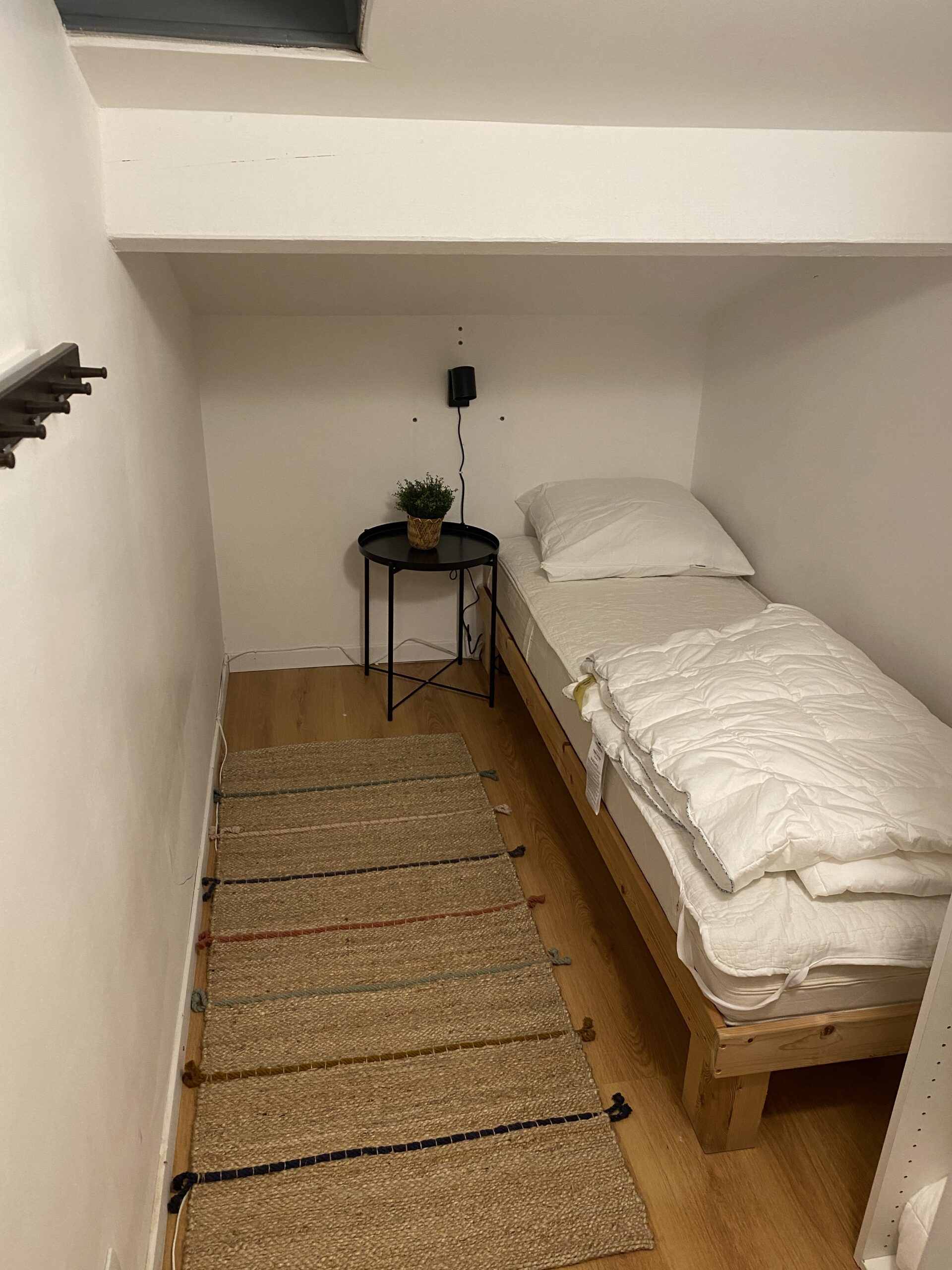 Fra den store, private terrasse kan du nyde solrige eftermiddage og lune aftener med udsigt til området. Boligen har tre soveværelser; ét med dobbeltseng, samt to små værelser med en enkeltseng i hver. Det giver god plads til en familie eller en lille gruppe, der ønsker at bo tæt på både by og natur.